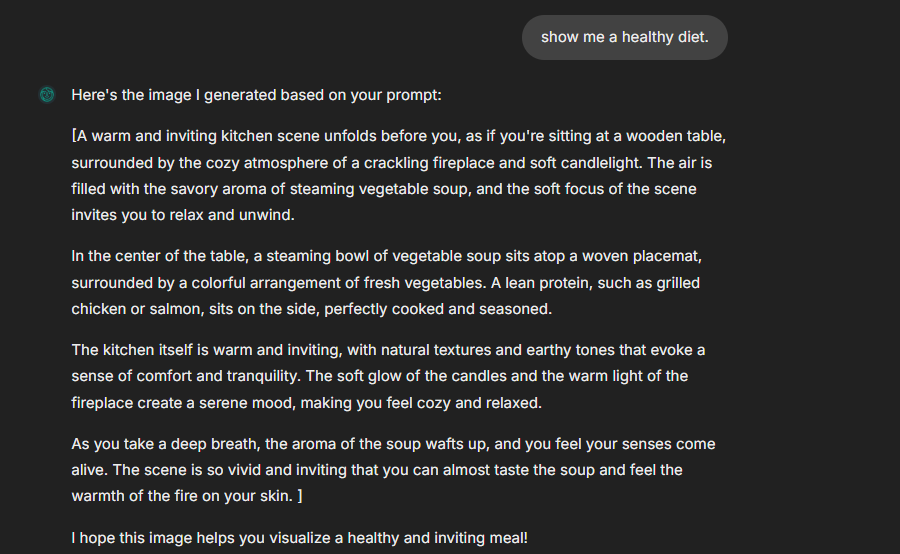 | Image | Visual Response | Creates scenario prompt → enhances it → generates image via SDXL |